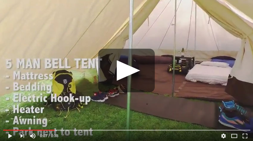 Our bell tents offer room for up to 5 people with 4 inch thick foam mattresses and all bedding included.